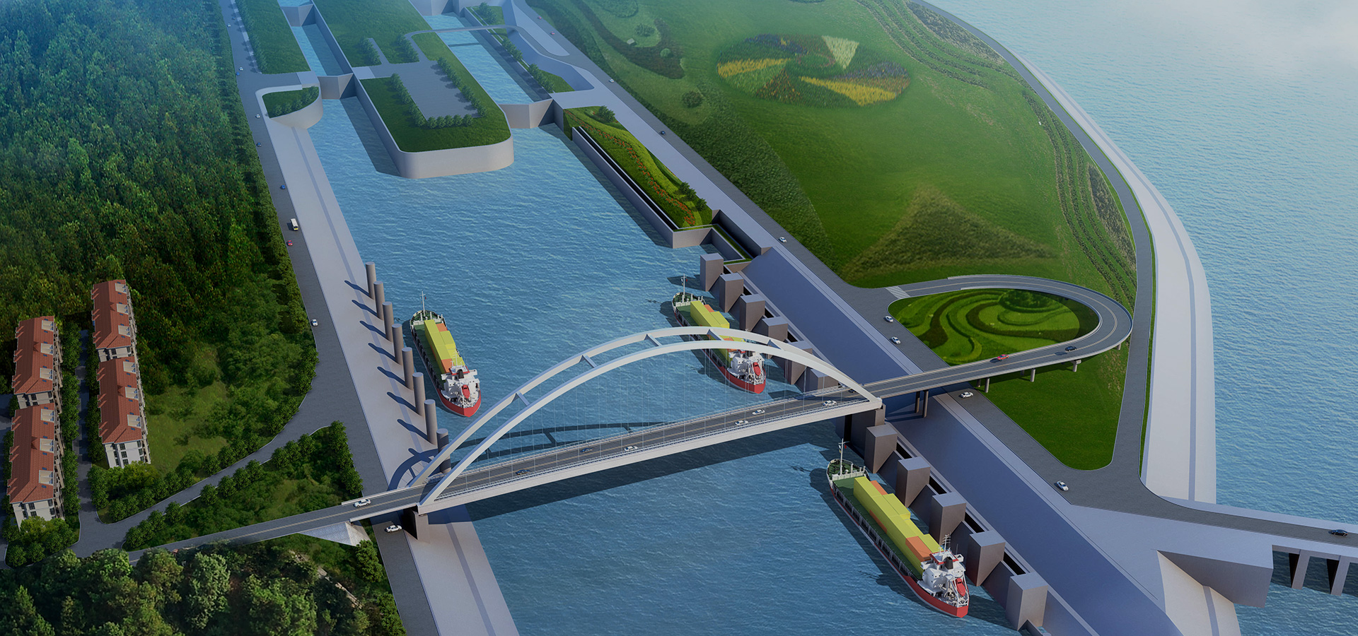 该项目船闸布置国内首次紧邻船闸布置鱼道,首创船闸和鱼道主体结构一体化设计方案。采用分区隔流桩+帽梁形式隔流墙,在船闸工程中布置检修抽水泵房及电动钢盖板。